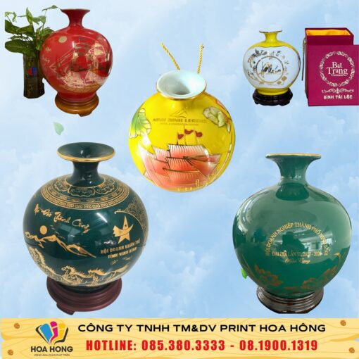 Bình tài lộc in logo doanh nghiệp do Công ty TNHH TM&DV PRINT HOA HỒNG – Quà tặng Hoa Hồng in ấn sử dụng phôi bình là bình gốm sứ Bát Tràng chất lượng cao, được khắc khảm họa tiết vàng vô cùng sang trọng với nhiều chủ đề khác nhau như: Mã Đáo Thành Công, Thuận Buồm Xuôi Gió,…